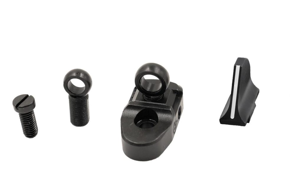 he white stripe front sight available to fit ramped or dovetail configurations offers increased visibility for dawn dusk or deep timber hunts. The white stripe offers excellent contrast against dark colored targets or game animals and the blued steel edges increase utility when shooting lighter colored deer or paper targets. Due to moving the rear sight from the barrel to the receiver some zeroing issues might arise. Alternate front sight heights are available. For use with Lever Rail only.