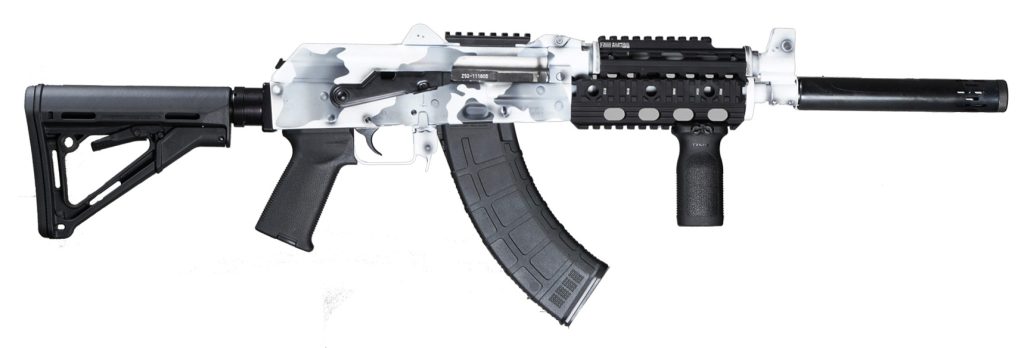 The ZPAP92 is loaded with features that include a dimpled 1.5mm receiverbulged trunnion chrome lined cold hammer forged barrel hinged top cover krink-style rear sight dual aperture front sight and a bolt hold-open notch on the selector. – This model features quad rail top rail buffer tube adaptor 16.5 barrel w/pinned & welded muzzle extension foregrip magpul CTR stock extended barrelArtic white camo cerakote – Features: – 7.62x39mm caliber – Semi automatic action – 30 +1 round capacity – 10 cold hammer forged chrome lined barrel – Stamped steel 1.5mm receiver with bulged trunnion – Corrosion resistant hard nickle molly steel bolt carrier – Hinged top cover – Bolt hold-open notch on the safety selector – Krinkov style rear post front sights – Synthetic grip – Quad rail – 19.3 overall length – Weight is 6.6 lbs. – Booster – Top rail – Welded barrel extension – Magpul CTR stock – Artic white camo cerakote